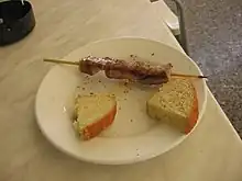 - (γαστρονομία) κομμάτια κρέατος που είναι κομμένα ομοιόμορφα και ψήνονται περασμένα σε ξύλινη («καλαμάκι») ή μεταλλική μικρή σούβλα