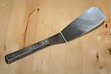 - σπάτουλα < (αντιδάνειο) < βενετική spatola < λατινική spatula, υποκοριστικό του spatha < αρχαία ελληνική σπάθη[1]