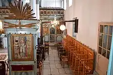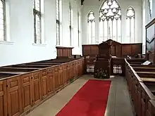 ![]() Ξύλινα στασίδια με μορφή μεμονωμένων καθισμάτων με χωρίσματα. |