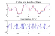 Στο πάνω σχήμα έχουμε το αρχικό (αναλογικό), με μπλε χρώμα, και την μετατροπή του σε ψηφιακό (κβαντισμένο) σήμα, με κόκκινο. Στο κάτω σχήμα αναπαρίσταται η διαφορά (σφάλμα κβαντισμού) του αναλογικού με το κβαντισμένο