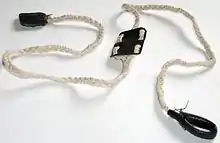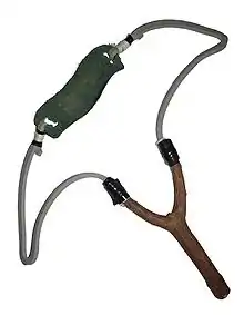 - πρωτόγονο όπλο κατασκευασμένο από ιμάντες που χρησιμεύει για τη ρίψη πετρών