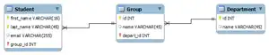 Ένα διάγραμμα οντοτήτων συσχετίσεων με τρεις πίνακες και τις συσχετίσεις μεταξύ των γραμμών τους. Οι πίνακες Group και Department (και οι αντίστοιχες εγγραφές τους) είναι σχετικοί γιατί συνδέονται με τα κλειδιά depart_it (εξωτερικό) και id (πρωτεύον). Παρόμοια και οι πίνακες Student και Group.