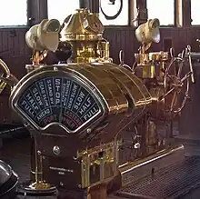 «Τηλέγραφος», μέσω του οποίου μεταβιβάζονταν παλαιότερα οι εντολές μηχανής από τη γέφυρα του πλοίου στο μηχανοστάσιο. Διακρίνεται η θέση finished with engines, δεξιά από την κεντρική θέση stop (κράτει).