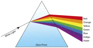- ※ Τα χρώματα του φάσματος, κατά σειρά μείωσης του μήκους κύματος, είναι: ερυθρό, πορτοκαλί, κίτρινο, πράσινο, κυανό και ιώδες. Τα χρώματα αυτά δεν αναλύονται σε άλλα απλούστερα και, αν τα ανασυνθέσουμε, θα αναπαραγάγουμε το λευκό φως.