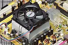 Ψύκτρα από αλουμίνιο με ανεμιστήρα πάνω από τον επεξεργαστή ηλεκτρονικού υπολογιστή. Δίπλα της διακρίνεται μία μικρότερη ψύκτρα, χωρίς ανεμιστήρα, πάνω από άλλο ολοκληρωμένο κύκλωμα της μητρικής.