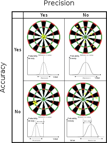 - κοντά στην ορθή τιμή όταν παίρνεις πολλές μετρήσεις (πολλές μετρήσεις χρειάζονται για στατιστική αξιολόγηση) όμως δεν προσδιορίζει η λέξη accuracy το εύρος διασποράς μεταξύ των μετρήσεων (συγκρίνετε με το precision