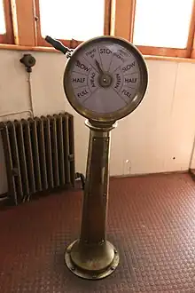 «Τηλέγραφος», μέσω του οποίου μεταβιβάζονταν παλαιότερα οι εντολές κίνησης από τη γέφυρα στο μηχανοστάσιο του πλοίου. Διακρίνεται και η εντολή full ahead (πρώτη από αριστερά στο καντράν).