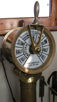 «Τηλέγραφος», μέσω του οποίου μεταβιβάζονταν παλαιότερα οι εντολές κίνησης από τη γέφυρα στο μηχανοστάσιο του πλοίου. Διακρίνεται και η εντολή full astern (η πρώτη από αριστερά στο καντράν).