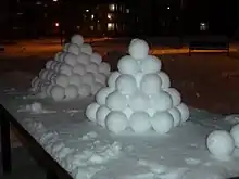 - χιονόμπαλα; μπάλα από χιόνι, όπως αυτές που φτιάχνουμε όταν παίζουμε χιονοπόλεμο